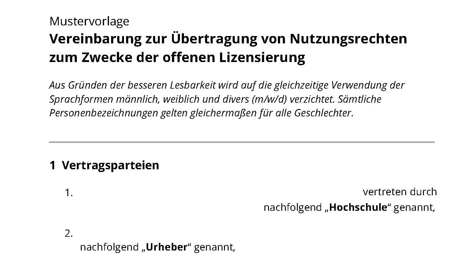 Das ZOERRDas Zentrale Open Educational Resources Repositorium (ZOERR) More hat eine Mustervorlage für einen Vertrag zur Übertragung der Nutzungsrechte veröffentlicht.
